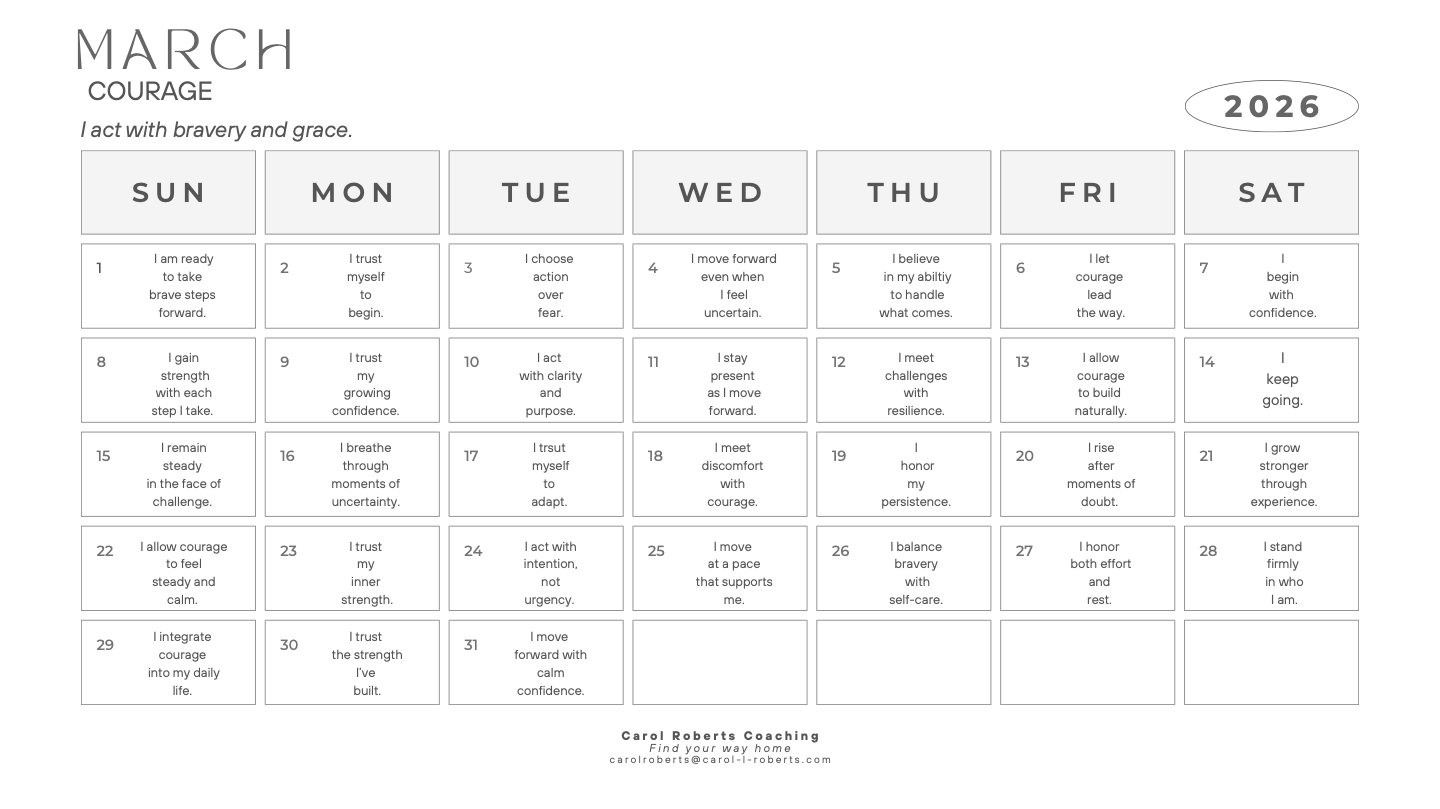 A reflective, printable monthly calendar designed to bring steady courage into your everyday life. Thirty-one daily affirmations offer small, consistent reminders of strength and self-trust.